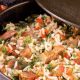 Leve ao fogo azeite, toucinho, linguiças, frango, a carne e deixe dourar, mexendo sempre em fogo alto. Junte a costelinha e o alho. Deixe fritar e junte o arroz, refogue bem.